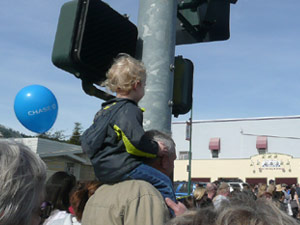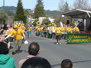 Maybe it was the warm sunshine. Maybe it was a hint of spring on the breeze. Maybe it was the promise of corndogs and lemonade or the promise of the midway. Maybe…but most likely, the cause of my giant grin was the unexpected whirling tornado of energy and music that was the Humboldt State University Marching Lumberjacks who charged in right behind the Cloverdale Fire and Rescue team and really fired up the crowd with their devil-may-care, torpedoes-be-darned, free-for-all performance. The HSU marching band really understood that marching bands are two parts music, two parts energy, one part performance, and twenty-seven parts presence. Their enthusiasm, their sound, and their bright yellow, “this is my freaking costume” get-ups made them a welcome tangy taste to this Citrus Fair’s otherwise sweet flavor. After their musical number, many band members ran down the parade route, high-fiving the kids and anyone sticking out a hand. They turned the parade into a party, and we were all invited. They are referred to as “the only remaining, real scatter band from a public university and the only scatter-marching band in the known universe.” They’ve been in a movie, appeared on TV, and have been pictured in many magazines and newspapers, including National Geographic. I recommend checking out their website at www.kissouraxe.com.