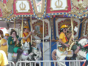 As the ride began to spin, the entire band began to play. Imagine, if you will, about twenty-five college students with noisemakers packed onto a small, twenty-person-maximum merry-go-round belting out Ozzy Osborne’s “Crazy Train” while another thirty or so band members blasted away from the sidelines. It was a whirling frenzy of music and smiles. It’s something I never would have expected to see. It was loud, absurd, silly, startling, and downright fun! While the fair and the parade was a great slice of Americana, the Humboldt State University Marching Lumberjacks made this an a’fair I’ll certainly never forget.