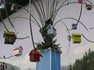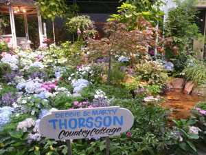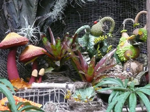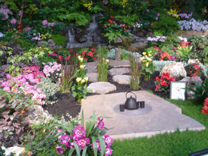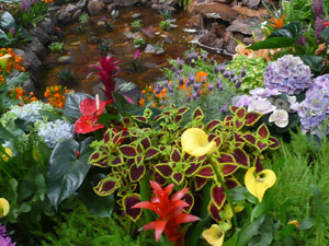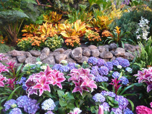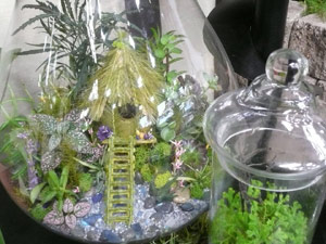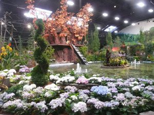 Every year, the exhibit hall is transformed into a wonderland of waterfalls, miniature houses, and elaborate displays of color reminiscent of Willy Wonka’s chocolate factory, where everything is real (flowers) and not (scale and scope) at the same time. In the past, the themes have included the Wizard of Oz, Jurassic Park, and Alice in Wonderland. This year the theme is Backyard Blossoms, with tiny homes and alternative living spaces. There seemed to be small houses everywhere: real ones to live in, fairy gourd houses, houses in glass bowls, and miniature carved wooden houses.