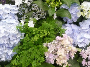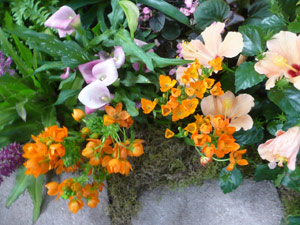 Other memorable elements were a red pagoda fountain and a fairy wood, complete with scraggly woods, a rock cairn, giant boulders, ferns, and miniature fairy houses. My personal favorite was the lovely cottage garden, “Country Cottage” which had a nice three-tiered fountain stream, gazebo, miniature house, lovely fuchsia stands, and a thick carpet (almost a pave) of hydrangea and maiden’s hair fern. Other stand-out elements included a wall of succulents and an extravagant use of orchids. (Flowers from the displays go on sale to the public after the fair ends–the plant sale is Monday, August 12th from 7:00 a.m. to 3:00 p.m.)