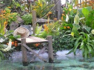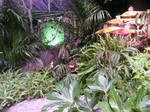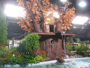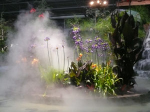 Every year there is one central water feature and murals to help set the overall tone. This year, to go with the theme, they have constructed a giant treehouse, complete with a tire swing on the edge of a great pond complete with a girls only sign, a fountain ladder and fog on one side; and a boys only sign and fishing hole on the other. The room is flanked on one side with a mural of the Hobbits’ Shire and garden, and a mountain of flowers with a waterfall on the other.
