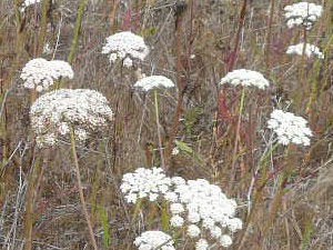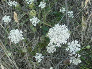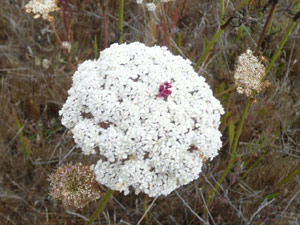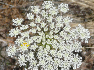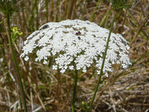 Queen Anne’s Lace (a member of the wild carrot family) has been naturalized in the states from Europe and Asia, likely as a companion crop to cultivated vegetables. Its name stems from its delicate snow-white, lace-like structure dotted with a single scarlet flower, presumably Queen Anne’s blood as she pricked her finger sewing the lace.