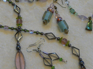Rachelle favors working with glass, choosing the better quality glass beads, crystal, some stone, and handmade glass. Although she likes all colors, lately she finds herself especially attracted to grays and pinks, purples and greens, copper and bronze. Her materials come from all over: local bead stores, thrift stores, Fire Mountain Gems, and online auctions. Working in an office station by a big window with natural light, she takes her time, does not repeat anything she makes, and does her best work “when I don’t have a chance to over-think it.” For her, beading is a creative outlet. “I like to make pretty things, sparkly things. I like to make people smile, to make them happy.” To find out more about W.I.N.G, Rachelle’s jewelry, you can call 707-827-3424 (serious inquiries only, please).