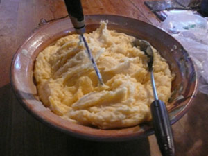 Mash in a bowl. Shred cheese into bowl and add salt and pepper to taste. Roll out the dough until thin.