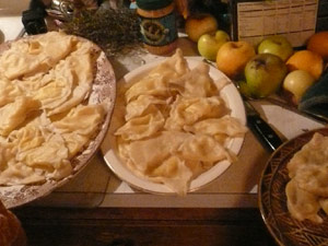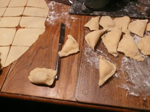 Once most of the stuffing, and all of the dough is used up, add dumplings to a pot of boiling water and remove them when they float and feel more like thick noodles than dough. When you have boiled them you can fry them with onions and serve with sour cream (if you like) or eat them as is.