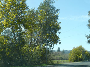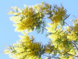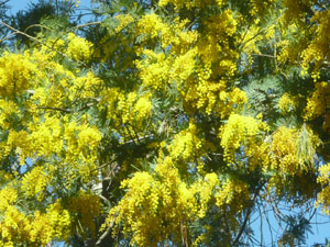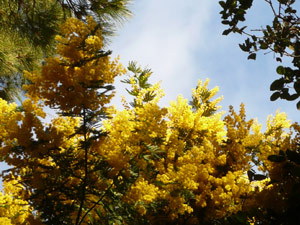 Acacia blossoms are small, yellow puff balls (somewhat like miniature pom-poms), draped luxuriantly at the ends of tendrils and surrounded by delicate fern-like leaves. The trees are beautiful year-round, but really become visible, brightening the landscape with intense splashes of yellow, in February and March.