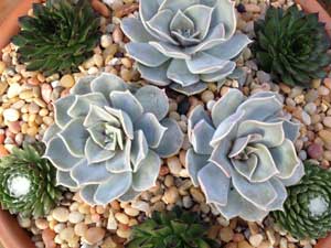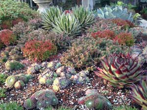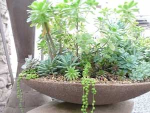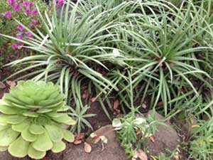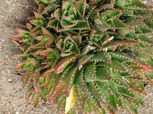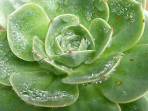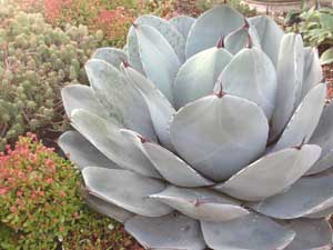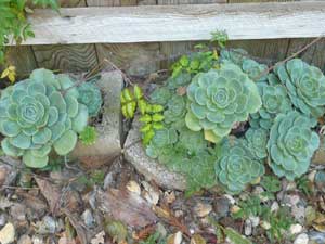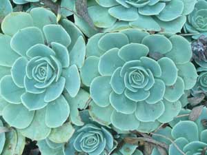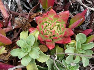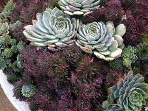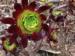 Succulent, what does that word make you think of? Tasty, mouth watering? Well, yes although many succulents (like Aloe Vera –a healing plant) are bitter, they do look thick enough to eat. Their relatively impervious or stiff skins helps seal in the water stored in their leaves (and sometimes in their roots as well). Like cactus (a related botanical group), these water-filled plants are drought tolerant and can be found in dessert-like conditions. But they can also be found at the beach, where they collect condensation from fog mist. These plants are often low to the ground and many make excellent ground covers.