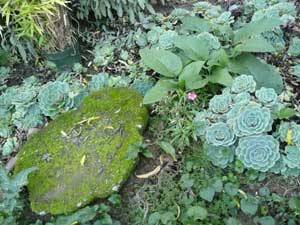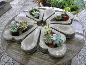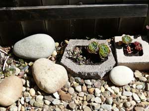 In our yard we had an area of high sun with low water area along a fence. At first we were not sure what to do with this very limited space. We had rocks left over from the front of the house, and then I got inspired by something I saw in Martha Stewart Living. I filled some concrete forms I found with soil and added some hen-and chicks donated from my aunt’s garden and a few store-bought plants for contrast. They have done very nicely in this hot, seldom-watered location. Here they are now, several years later, doing well, adding visual interest to an otherwise blah area.