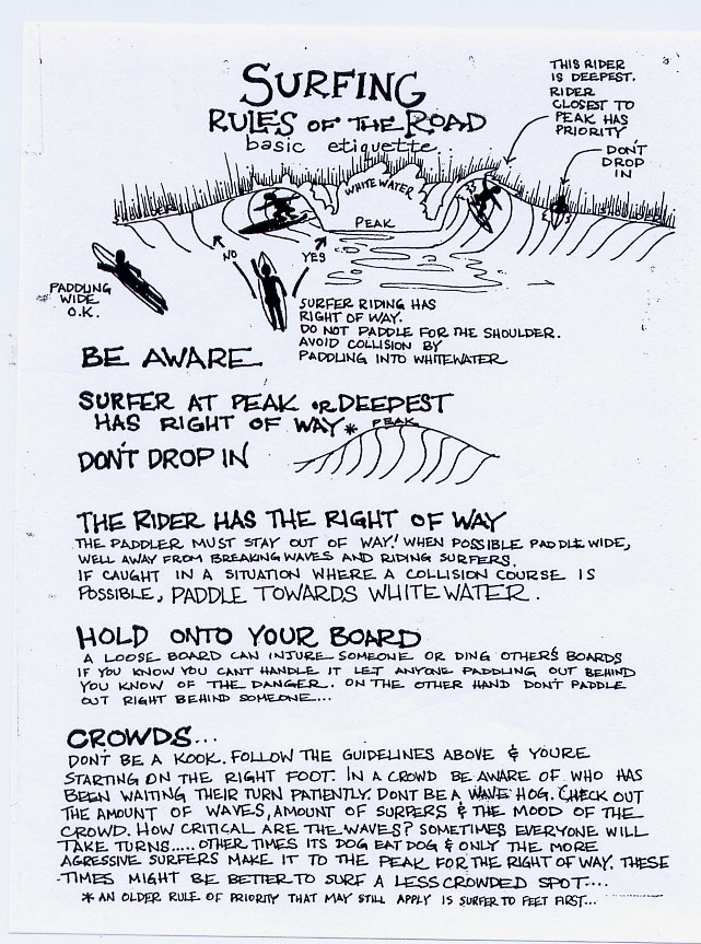 “Experienced Surfers are on their own. You should know what you are looking for. Come alone or with one other person, not in a car full of Marinites. No one likes 7 guys jumpping out at your favorite spot. Although we are not localists.”